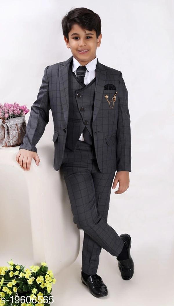 Fourfolds Boy's 5-piece Suit Top Fabric: Polyester Bottom Fabric: Polyester Sleeve Length: Long Sleeves Top Pattern: Checked Bottom Pattern: Checked Multipack: Single Add-Ons: Waistcoat Sizes: 5-6 Years (Top Chest Size: 24 in, Top Length Size: 16 in, Bottom Waist Size: 11.5 in, Bottom Length Size: 22 in) 15-16 Years (Top Chest Size: 28 in, Top Length Size: 18.5 in, Bottom Waist Size: 13 in, Bottom Length Size: 26 in) 12-13 Years (Top Chest Size: 24 in, Top Length Size: 16 in, Bottom Waist Size: 11.5 in, Bottom Length Size: 22 in) 13-14 Years (Top Chest Size: 25 in, Top Length Size: 17 in, Bottom Waist Size: 12 in, Bottom Length Size: 23.5 in) 14-15 Years (Top Chest Size: 26 in, Top Length Size: 17.5 in, Bottom Waist Size: 12.5 in, Bottom Length Size: 24.5 in) 10-11 Years (Top Chest Size: 30 in, Top Length Size: 19 in, Bottom Waist Size: 14 in, Bottom Length Size: 29 in) 11-12 Years (Top Chest Size: 23 in, Top Length Size: 15 in, Bottom Waist Size: 11 in, Bottom Length Size: 20 in) 8-9 Years (Top Chest Size: 28 in, Top Length Size: 18.5 in, Bottom Waist Size: 13 in, Bottom Length Size: 26 in) 6-7 Years (Top Chest Size: 25 in, Top Length Size: 17 in, Bottom Waist Size: 12 in, Bottom Length Size: 23.5 in) 7-8 Years (Top Chest Size: 26 in, Top Length Size: 17.5 in, Bottom Waist Size: 12.5 in, Bottom Length Size: 24.5 in) 9-10 Years (Top Chest Size: 30 in, Top Length Size: 19 in, Bottom Waist Size: 13.5 in, Bottom Length Size: 28 in) Country of Origin: India