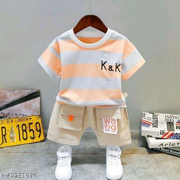 Hopscotch Boys Cotton and Polyester Half Sleeves Horizontal Stripe Printed T-Shirt and Short Set in Orange Color (1024175)