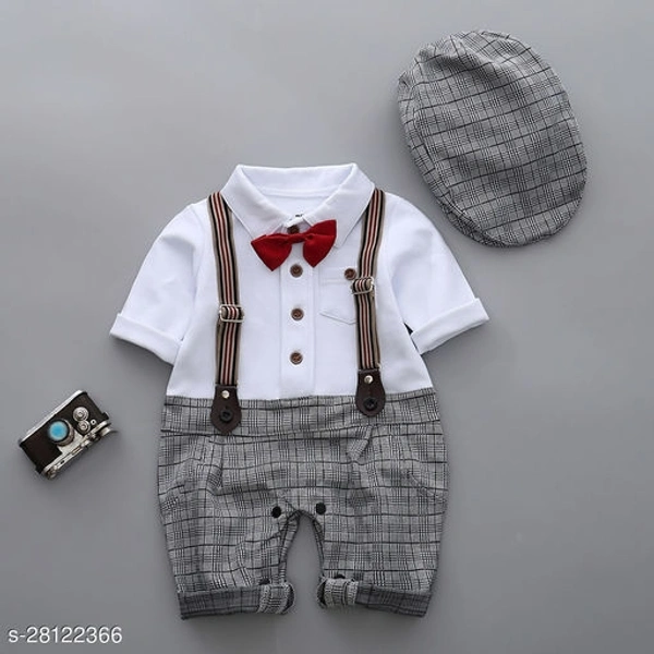 Hopscotch Boys Cotton, Poly Suspender Style Bow Applique Romper in Gray Color (699051)