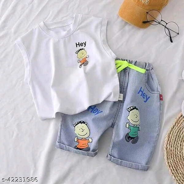 Newbron Boys Cotton White Print Tops With Denim Bottom